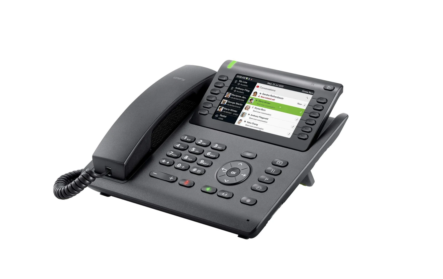 – 7 fest programmierte Funktionstasten (Menü/Out-of-office/Sprachnachrichten/Halten/Transfer/Konferenz und Wahlwiederholung)